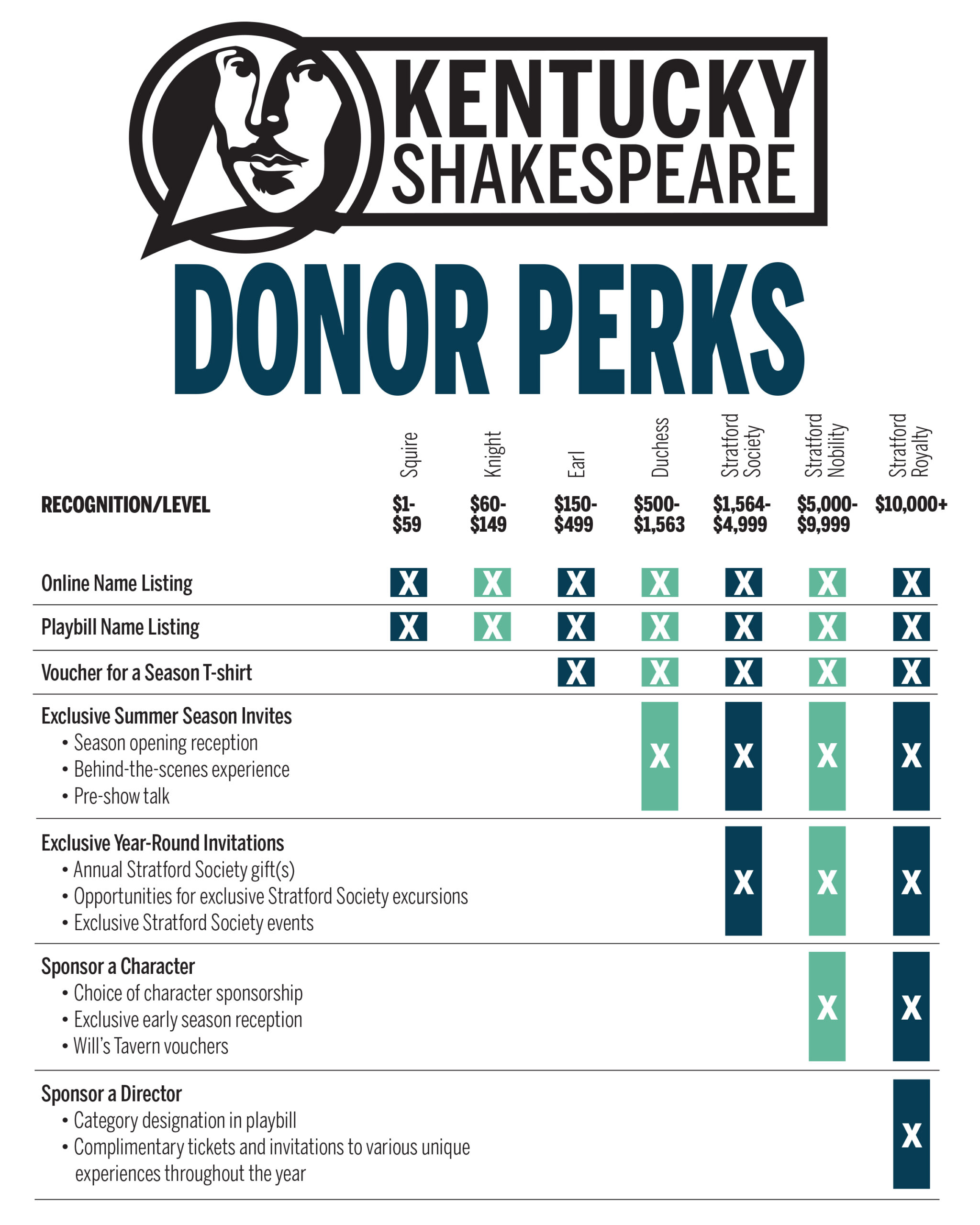 Your contribution to YOUR Kentucky Shakespeare is tax-deductible. We accept and encourage monthly giving – just like public radio, set an amount and never worry about it again, unless you want to change something.